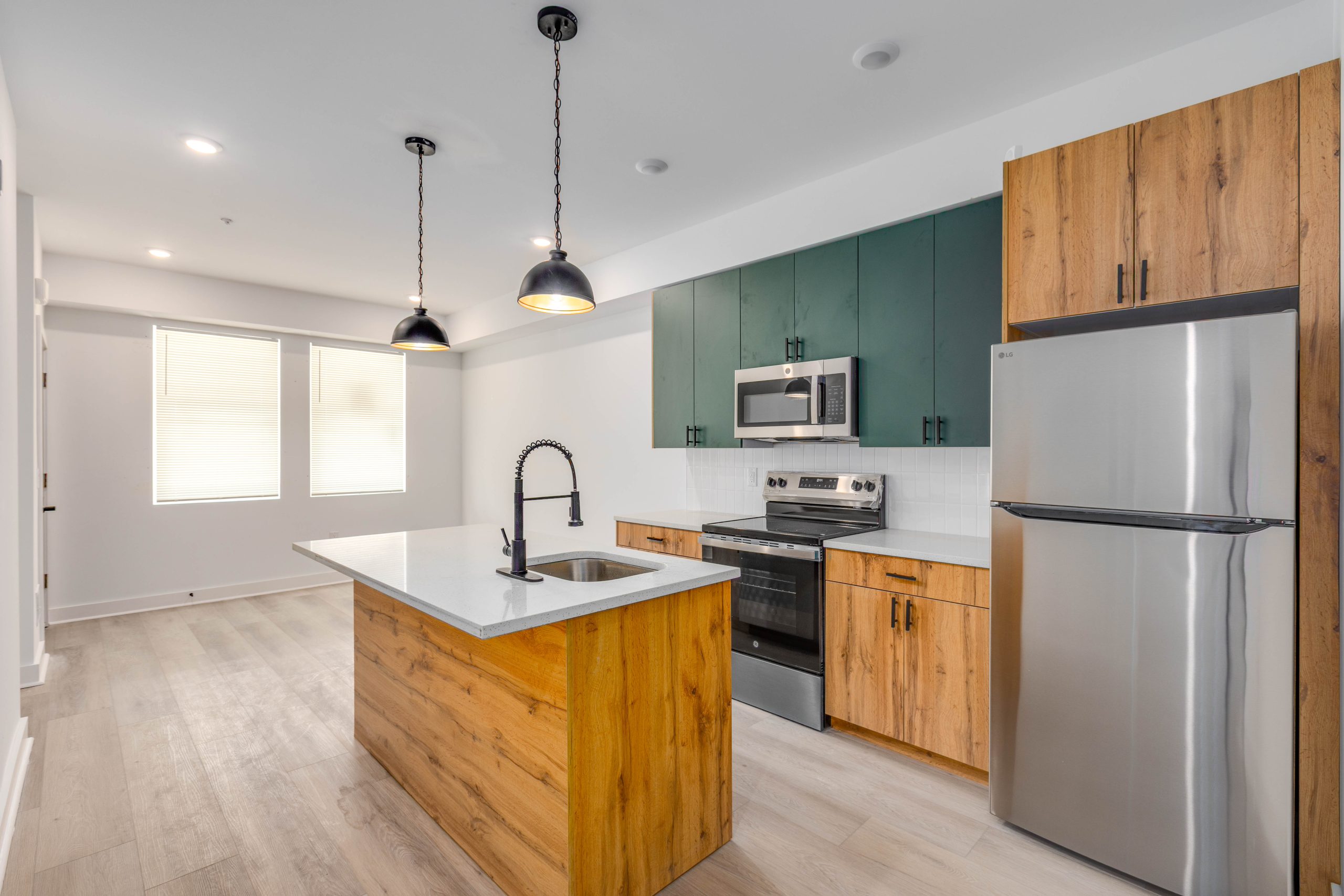 The modern kitchen is equipped with stainless steel appliances, plenty of cabinet space, and a sleek countertop, making meal preparation a breeze. Both bedrooms are generously sized with plenty of closet space.