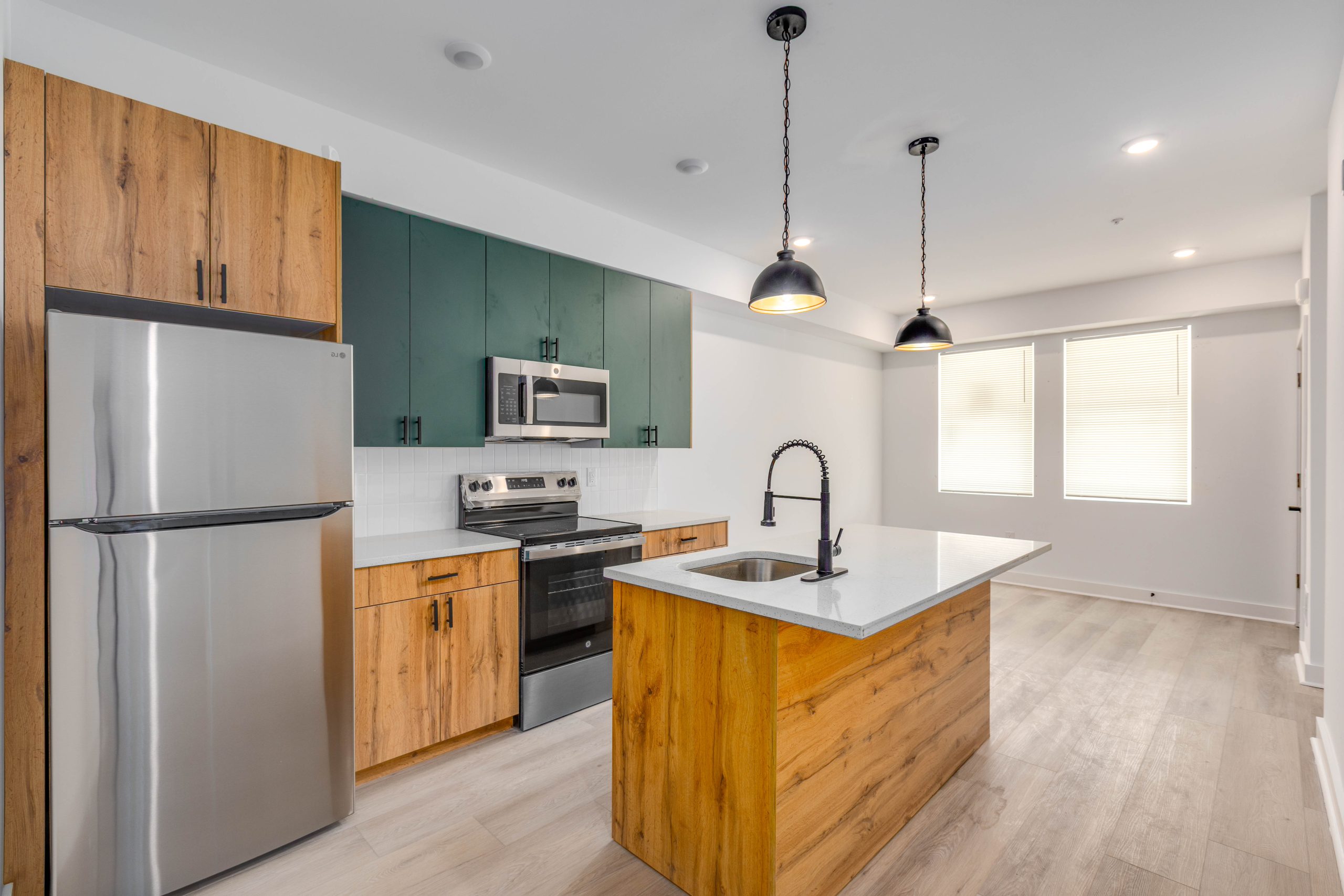 The modern kitchen is equipped with stainless steel appliances, plenty of cabinet space, and a sleek countertop, making meal preparation a breeze. Both bedrooms are generously sized with plenty of closet space.