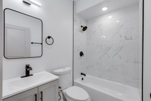 Each bathroom is stylishly designed, with modern fixtures and a clean, contemporary aesthetic. Additional amenities include in-unit laundry, central air conditioning for year-round comfort.