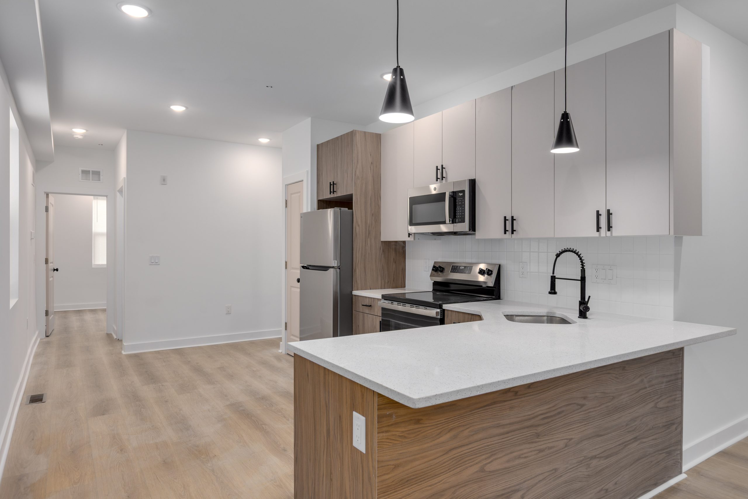 The modern kitchen is equipped with stainless steel appliances, plenty of cabinet space, and a sleek countertop, making meal preparation a breeze. Both bedrooms are larger size than standard with plenty of closet space.