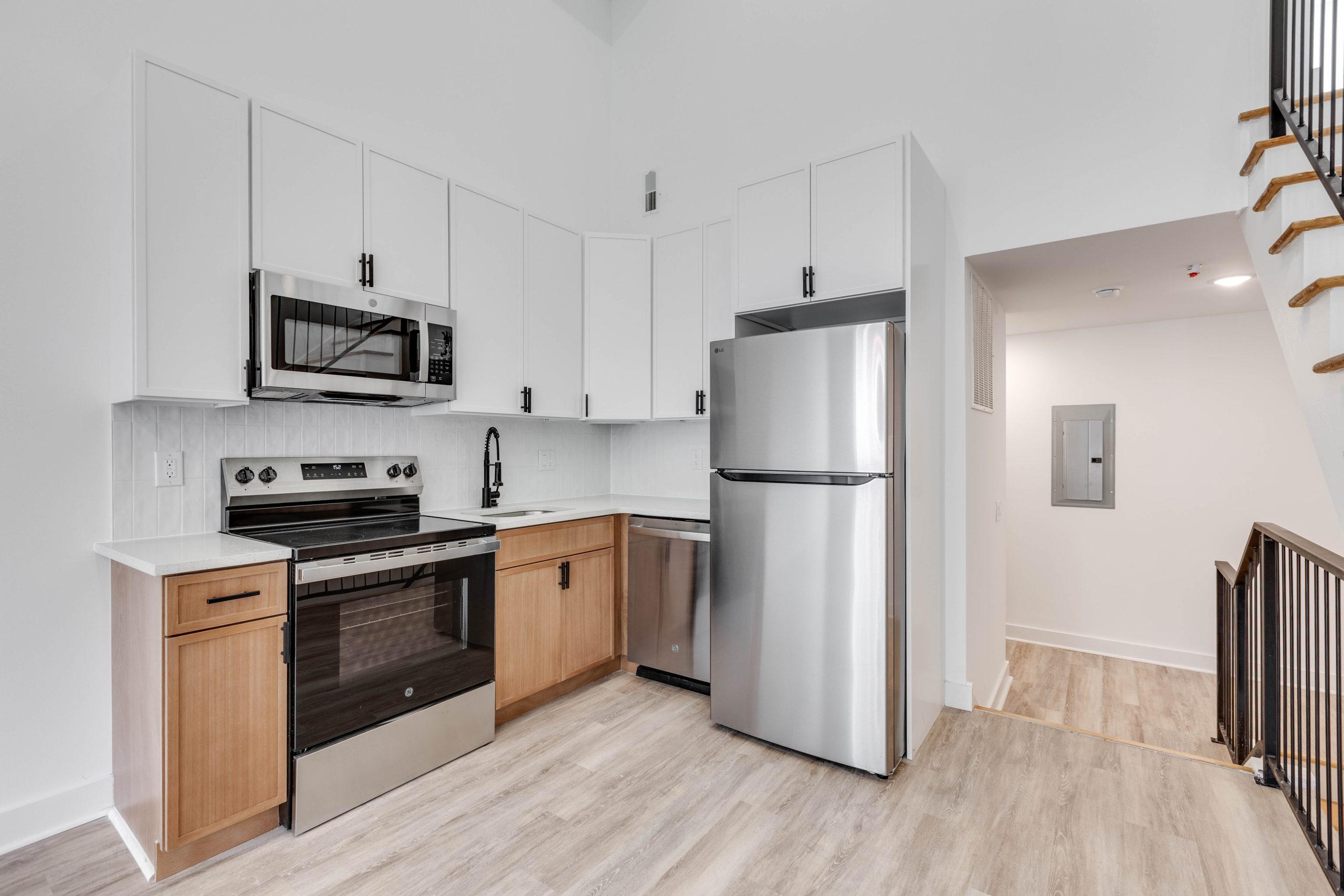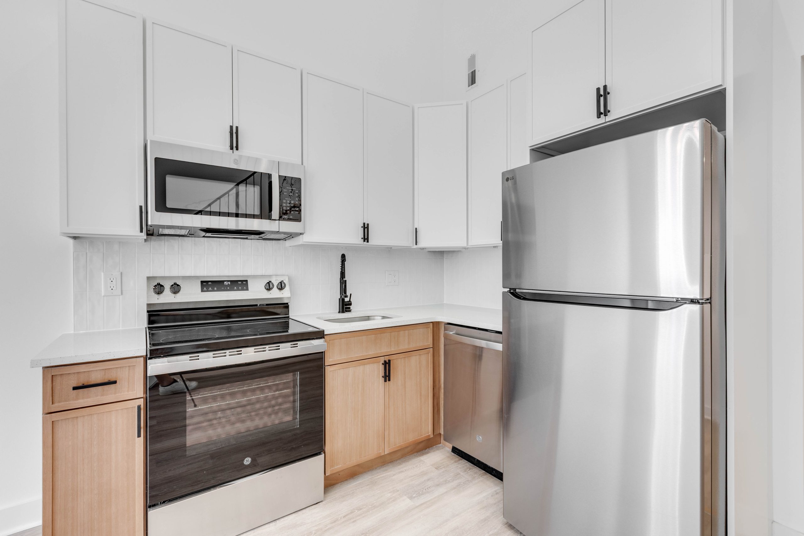 The modern kitchen is equipped with stainless steel appliances, plenty of cabinet space, and a sleek countertop, making meal preparation a breeze. Both bedrooms are generously sized with plenty of closet space.