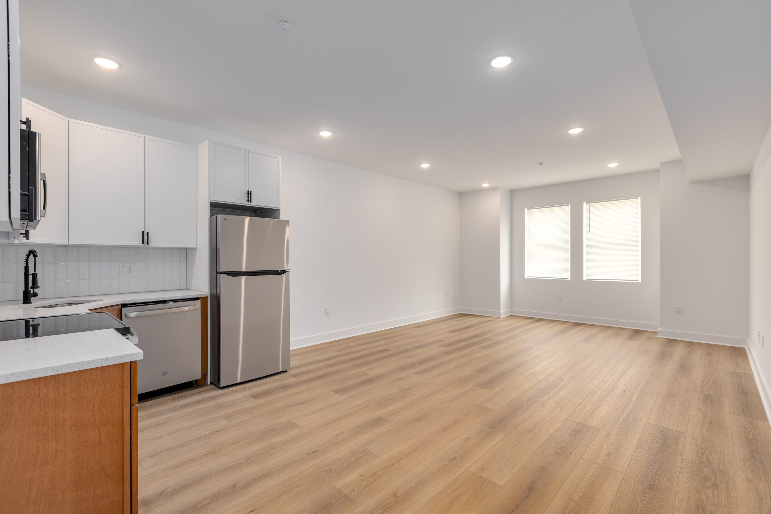 The modern kitchen is equipped with stainless steel appliances, plenty of cabinet space, and a sleek countertop, making meal preparation a breeze. Both bedrooms are generously sized with plenty of closet space.
