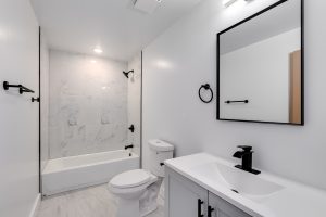 Each bathroom is stylishly designed, with modern fixtures and a clean, contemporary aesthetic. Additional amenities include in-unit laundry, central air conditioning for year-round comfort.