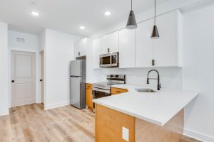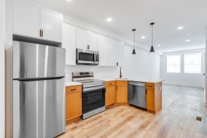 The modern kitchen is equipped with stainless steel appliances, plenty of cabinet space, and a sleek countertop, making meal preparation a breeze. Both bedrooms are generously sized with plenty of closet space.