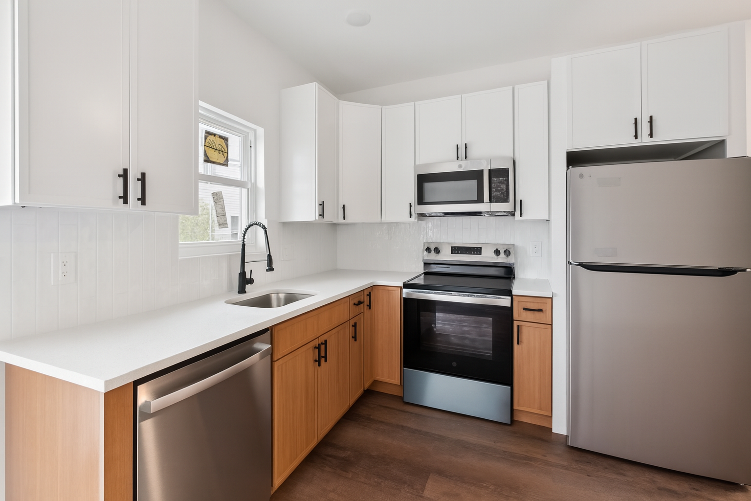 The modern kitchen is equipped with stainless steel appliances, plenty of cabinet space, and a sleek countertop, making meal preparation a breeze. Both bedrooms are generously sized with plenty of closet space.