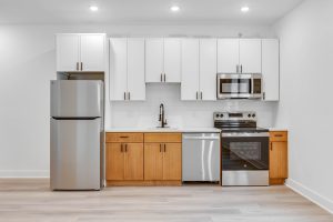 The kitchen is a chef’s dream, featuring stainless steel appliances, granite countertops, custom cabinetry, and a stylish tile backsplash. Sleek pendant lighting and modern fixtures add a touch of elegance.