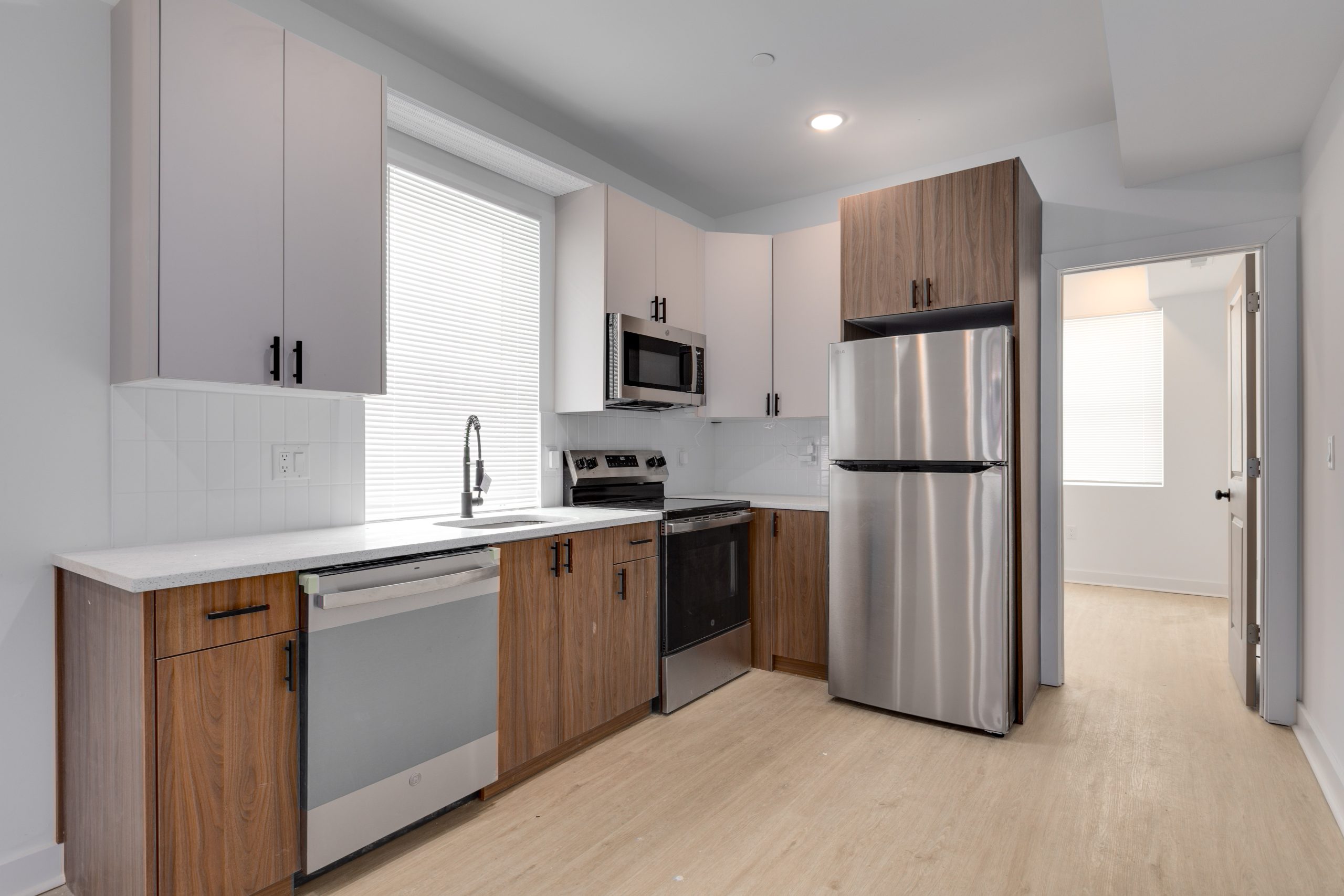 The modern kitchen is equipped with stainless steel appliances, plenty of cabinet space, and a sleek countertop, making meal preparation a breeze. Both bedrooms are generously sized with plenty of closet space.