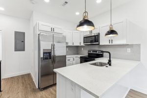 The modern kitchen is equipped with stainless steel appliances, plenty of cabinet space, and a sleek countertop, making meal preparation a breeze. Both bedrooms are generously sized with plenty of closet space.