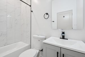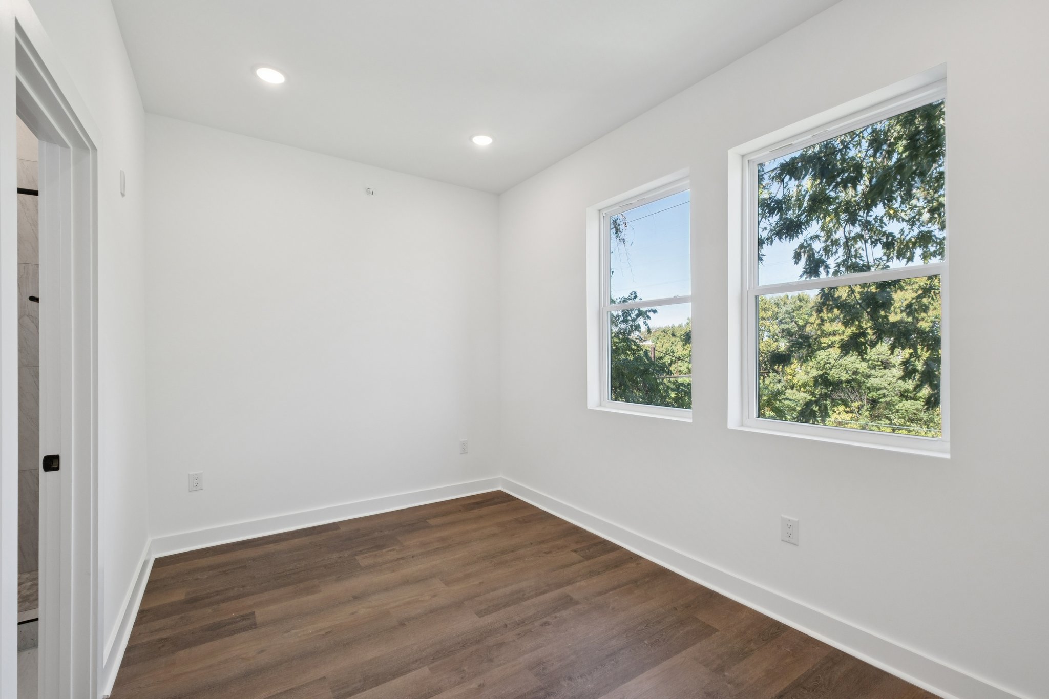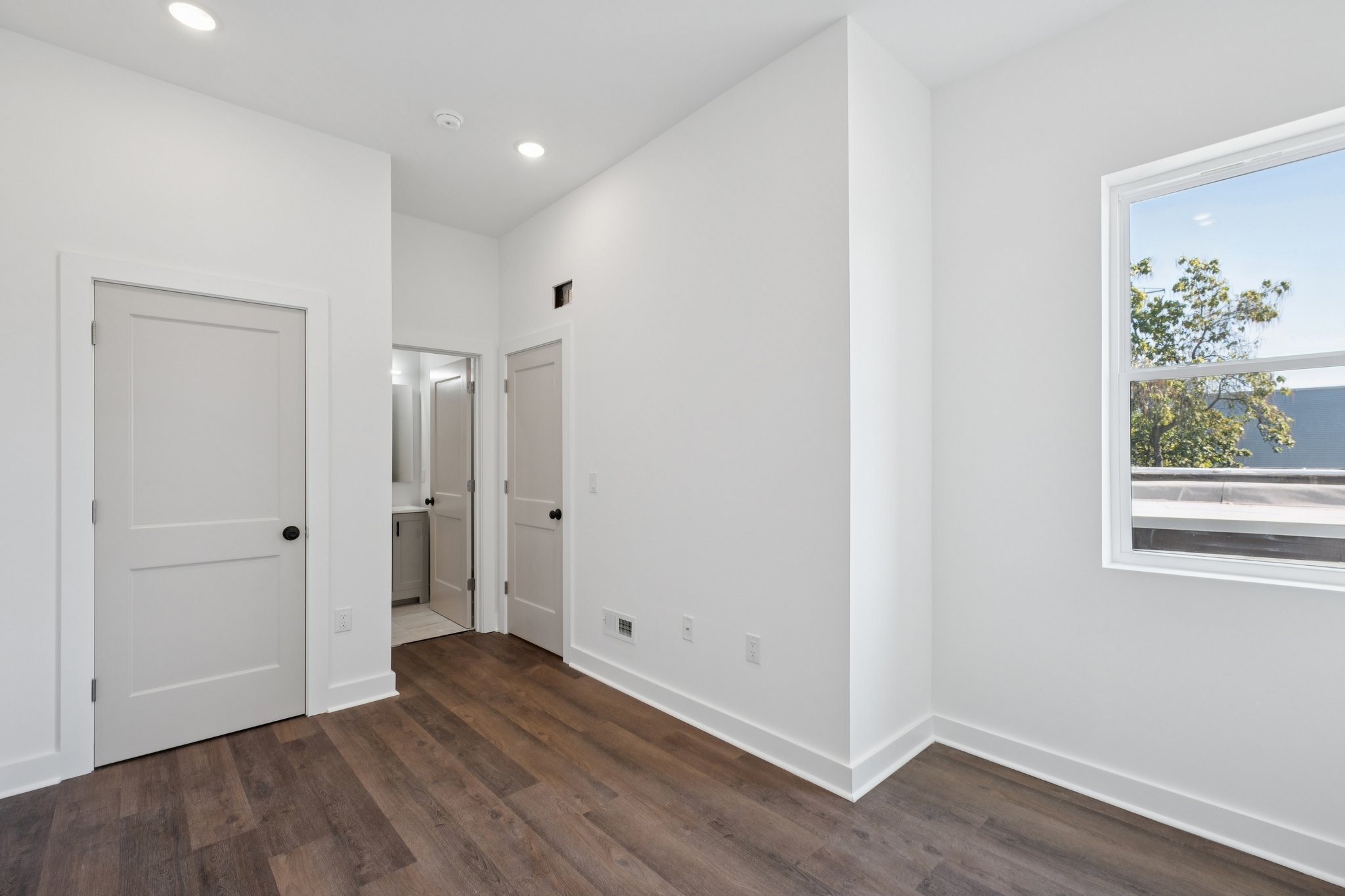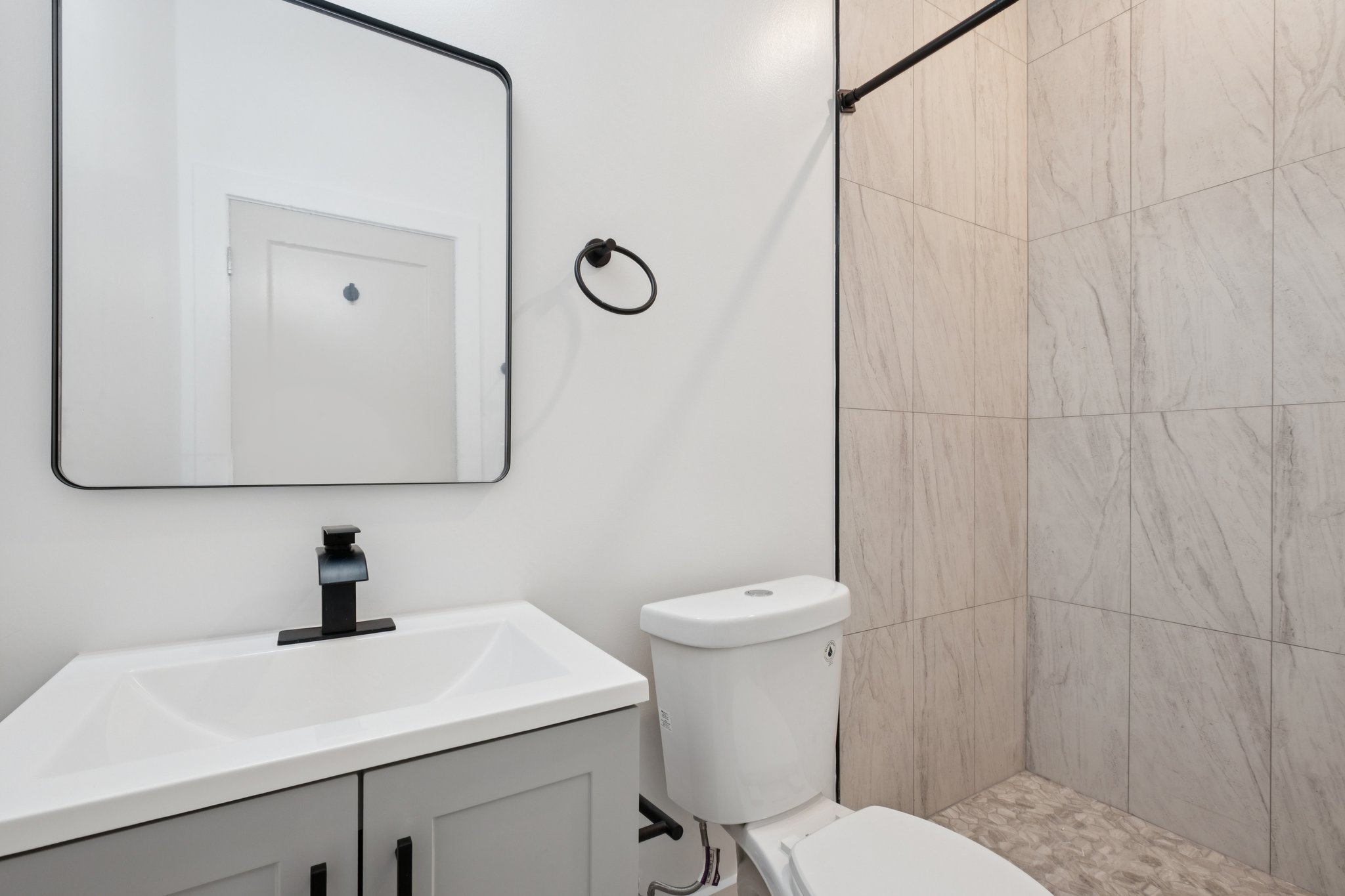 The spacious bedroom includes a walk-in closet, while the bathroom boasts stylish tiling and modern fixtures.